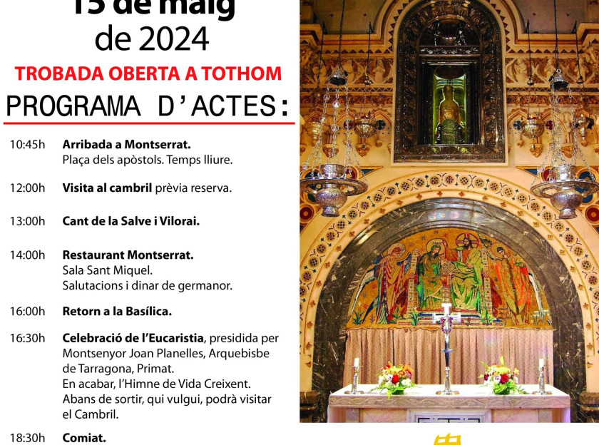 Amb el lema pastoral “Rosa de caritat”, el 15 de maig té lloc la 38ª Trobada Interdiocesana de Vida Creixent a Montserrat. L’horari és de 10.45 h a 18.30 h i és oberta a tothom. Per a inscripcions i informació cal trucar al Sr. Enric d’Ossó, coordinador del moviment de Vida Creixent a la diòcesi de Sant Feliu de Llobregat: 629 389 773.
