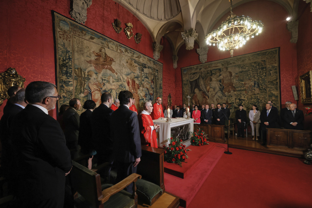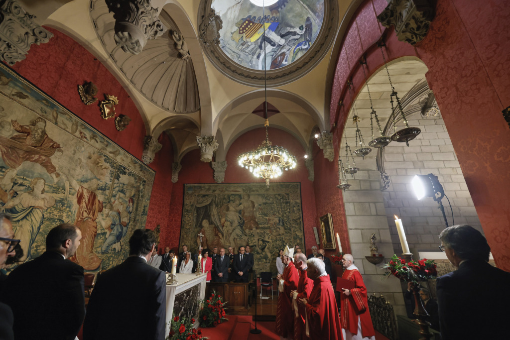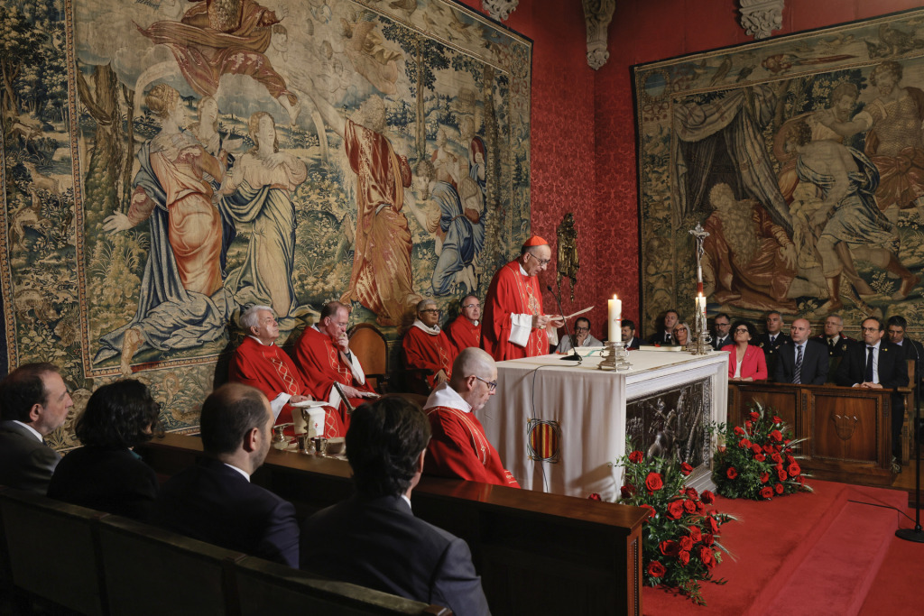 Un dels actes centrals de la Diada de sant Jordi és la missa al Palau de la Generalitat, que aquest any ha presidit l’arquebisbe de Barcelona, el cardenal Joan Josep Omella. L’eucaristia, que ha començat puntualment a les 9 del matí, ha reunit un gran nombre d’autoritats, entre elles el president de la Generalitat, Salvador Illa, el president del Parlament, Josep Rull i fins a vuit consellers del govern.