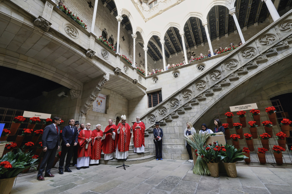 Després de l’eucaristia, el cardenal Omella també ha fet la tradicional benedicció de roses de les parades d’entitats al pati gòtic del Palau de la Generalitat. Aquest acte es va recuperar l’any passat, per iniciativa de l’actual govern.