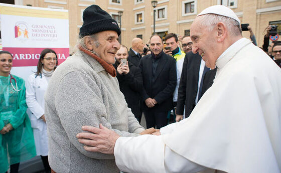 El papa Francesc de vegades preguntava als quis’anaven a confessar: «Fas almoina als pobres? Quan fas almoina mires els ullsde la persona que la demana? Toques la mà d’aquells a qui dones almoina?» Sónpreguntes que estan en plena sintonia amb la vida i l’actuació de sant Francescde qui el Bisbe de Roma va adoptar el nom. Conta la història que Francesccavalcava un dia per la plana d’Assís quan li va sortir a camí un leprós. Erael moment de donar a Crist la prova decisiva de la seva disponibilitat per «conèixerla seva voluntat». Fent-se enorme violència, Francesc va baixar del cavall, vaposar l’almoina a la mà del leprós i li va fer un petó; el leprós, al seu torn,va prémer contra els seus llavis la mà del benefactor.
