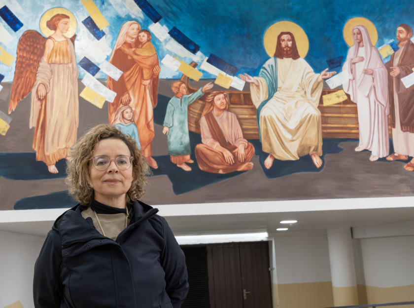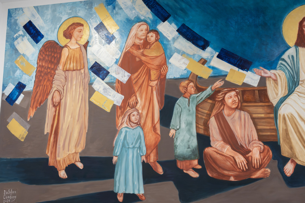 Les persones que accedeixen als espais annexos de la parròquia de Sant Lluís Gonçaga, al districte de Sant Martí de Barcelona, reben la benvinguda de Crist i la Comunitat, que és el títol del mural de la pintora i feligresa Ana Maria da Silva Cardoso, inaugurat el 14 de desembre passat. Un mural de sis metres amb Crist al mig, acompanyat per una representació dels membres de la comunitat parroquial. “És una benvinguda a la parròquia”, remarca Da Silva Cardoso, doctora en Belles Arts i professora de Dibuix.