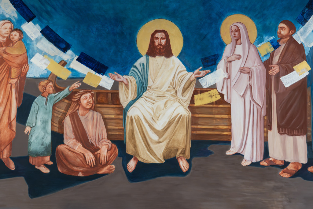 Moltes persones em pregunten si és una escena de l’Evangeli, i no. Ara bé, podria ser perfectament un moment qualsevol de la vida de Jesús. És molt factible que Jesús es trobés a la vora d’una barca i que rebés la visita de gent de la comunitat. Crist és la figura més important i, com a tal, és al centre de la pintura. Està en una posició molt relaxada, com de descans, en què convida la gent a apropar-s’hi. A través de les onze figures del conjunt vaig voler representar tota la comunitat: homes i dones de diferents edats, infants, joves. I tanquen l’escena dos àngels, remarcant que la comunitat és un espai protegit i sagrat.