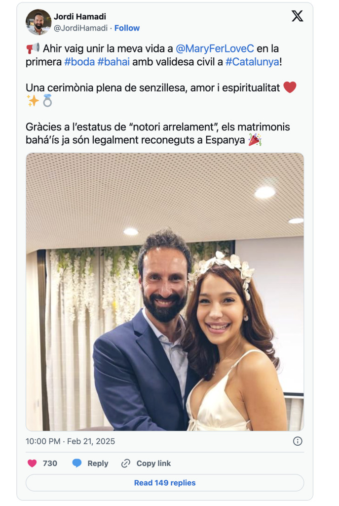 El dijous 20 de febrer, la ciutat de Barcelona va acollir el primer casament bahá’í amb validesa civil a Catalunya des que la Comunitat Bahá’í d’Espanya va obtenir l’estatus de Notori Arrelament. L’acte, celebrat al Centre Bahá’í de Barcelona, va tenir com a protagonistes Jordi Hamadi Puig (51 anys), economista, i Johanna Meryham Fernández Castillo (50 anys), periodista, que van unir les seves vides en una cerimònia que ja ha passat a la història de la fe bahá’í.