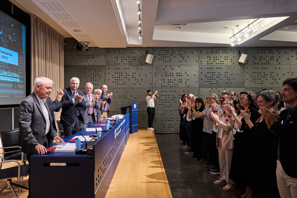 Un dels moments més emotius de la jornada va ser quan el Dr. Jordi Riera, director general de la Fundació Blanquerna, va retre homenatge als fundadors Miquel Tresserras, Albert Sáez i Josep A. Rom, destacant-ne la visió i la determinació per impulsar un projecte acadèmic pioner. El Dr. Salvador Pié, president de la Fundació Blanquerna en el moment de la creació, va subratllar la importància estratègica de la comunicació en les universitats d’inspiració cristiana, tot recordant les paraules del papa Francesc sobre la necessitat de promoure una «valenta revolució cultural des de la comunicació».