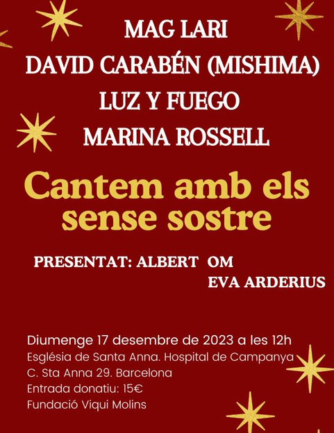 Des de fa sis anys l’estimada veu catalana —la més jove del grup de la “nova cançó”— de Marina Rossell va voler fer una cosa semblant amb el nostre estimat Hospital de Campanya de Santa Anna, i per això també un dia a cantar i celebrar pels nostres estimats sense sostre. Va ser ella la que va inaugurar aquest festival anual que ara es dedica a la Fundació Viqui Molins a favor dels joves beneficiaris de les Llars d’oportunitats.
