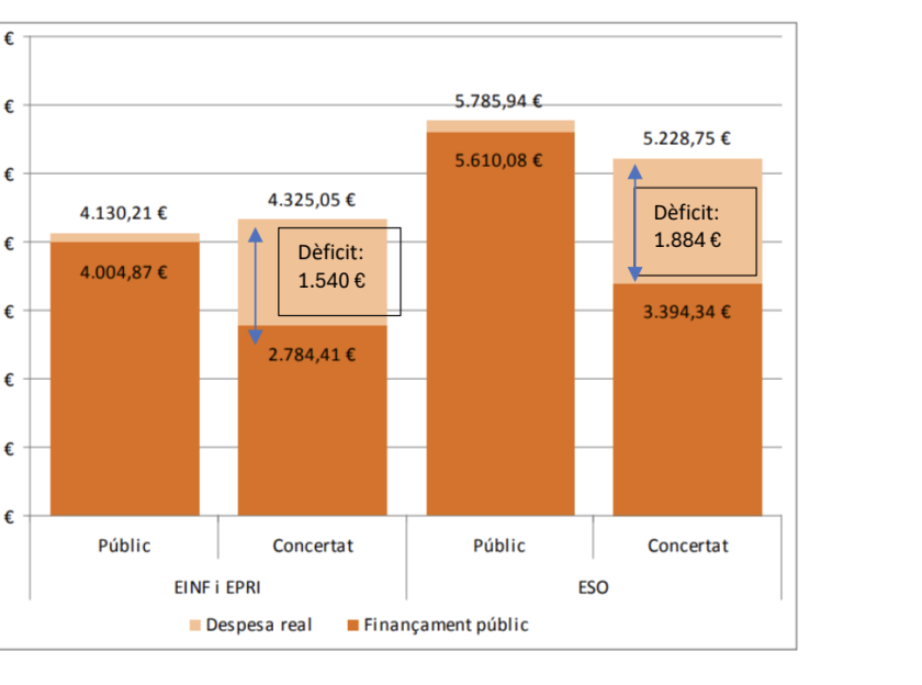 Com es pot veure a l’informe, el 50% de les escoles concertades de Catalunya estan situades en el tercil més baix de finançament públic, i això suposa que el dèficit d’aquest finançament s’hagi d’equilibrar amb pagaments més elevats, als quals han de fer front les famílies catalanes. El resultat d’aquesta anàlisi va en la línia de les conclusions de la Sindicatura de Greuges de Catalunya, que ja va alertar que el dèficit dels centres concertats és de 1.500 euros per plaça a primària i de 1.800 euros a secundària.