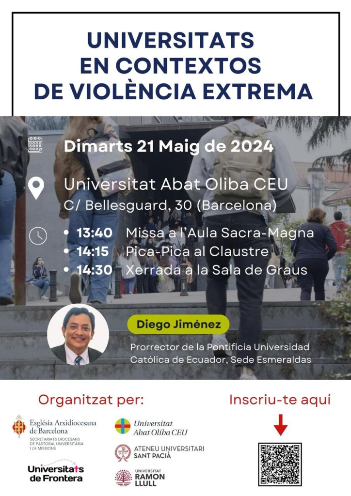 L’Arquebisbat de Barcelona, juntament amb les universitats d’inspiració cristiana de la ciutat, anuncia la visita de Diego Armando Jiménez, prorector de la Universitat Pontifícia de l’Equador amb seu a Esmeraldas, en el marc del projecte “Universitats de Frontera. Missió compartida”.