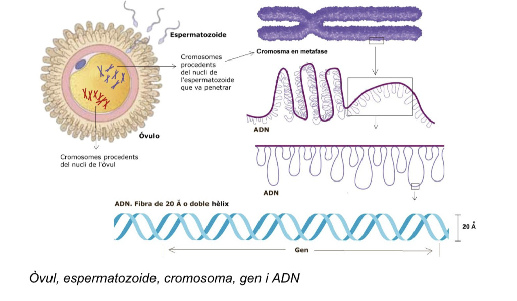 Tot i que el que segueix és molt complex, cal explicar-ho per entendre per què tots els humans som diferents i irrepetibles. Comencem dient que el cos d’un ésser humà adult, d’uns 70 kg de pes, té uns 36 bilions de cèl·lules, totes amb la mateixa informació genètica, és a dir amb el mateix ADN, ja que totes són filles de la seva primera cèl·lula, el zigot, que és la cèl·lula que es va formar després de la fusió d’un espermatozoide de la seva mare. L’ADN d’un espermatozoide no és una sola molècula, sinó 23 molècules d’ADN anomenades cromosomes. Cada cromosoma conté centenars de segments, anomenats gens, cadascun amb informació sobre una determinada proteïna humana. Entre els 23 cromosomes sumen 21.000 gens. Als òvuls passa el mateix, per la qual cosa el zigot conté 46 cromosomes, 23 heretats del pare i 23 heretats de la mare i conté 42.000 gens, 21.000 gens heretats del pare i 21.000 gens heretats de la mare.