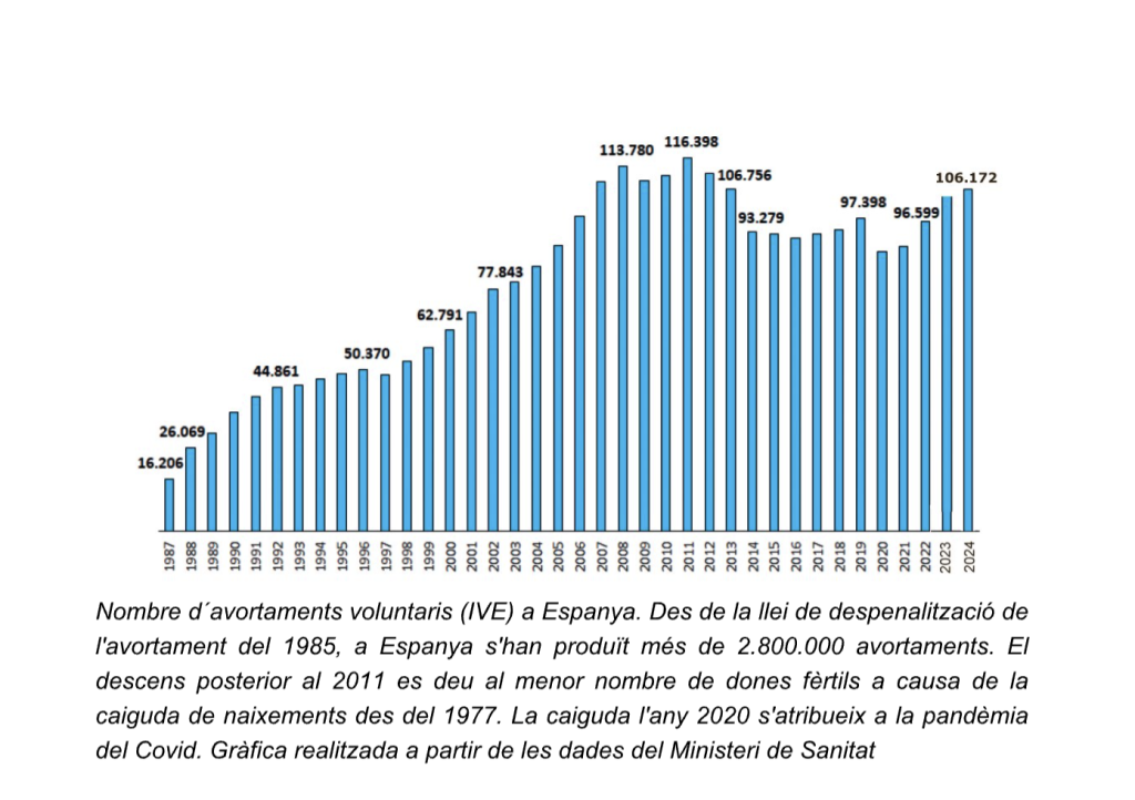 El 2024 a Espanya es van practicar 106.172 avortaments voluntaris. Això representa un augment del 24,9% respecte del 2004, és a dir en 20 anys. Pel que fa a la taxa de dones que han avortat, el 2024 va ser de 12,4 per cada 1000 dones, la segona més alta en els darrers vint anys. A Espanya l’avortament és la causa principal de mortalitat infantil de menors d’un any ja que totes les altres causes sumades no arriben a generar 1000 morts a l’any.