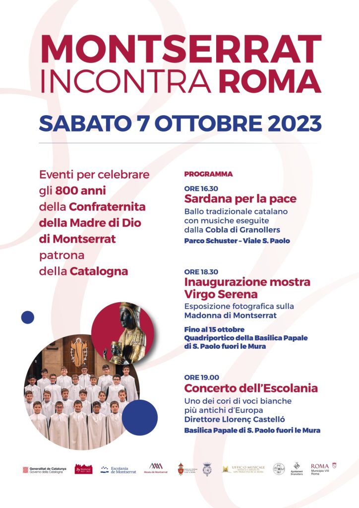 Un dels actes destacats és dissabte 7 a la tarda a la basílica papal de Sant Pau Extramurs. S’hi estrenarà la sardana per la pau de Mons. Miserachs, s’inaugurarà la mostra Virgo Serena, amb fotografies de gran qualitat de la imatge de la Mare de Déu de Montserrat realitzades per Lluís Casals l’any 2001 amb motiu dels estudis radiogràfics i de restauració de la imatge. I el concert de l’Escolania de Montserrat, que porta per títol 800 anys de música litúrgica a Montserrat.