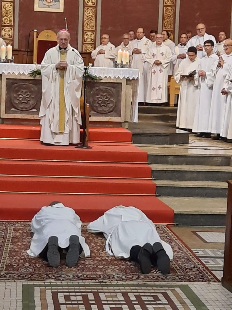 La catedral de Sant Llorenç de Sant Feliu de Llobregat va acollir aquest diumenge 14 de maig, al vespre, l’ordenació de dos nous diaques d’aquesta diòcesi, Toni Oia i Manuel Arnedo. La celebració, presidida pel bisbe Agustí Cortés, es va desenvolupar en un ambient de festa i alegria, amb el temple molt ple de familiars i amics dels nous ministres ordenats, com també de creients en general vinculats a les diverses realitats diocesanes. En l’homilia, el bisbe de Sant Feliu de Llobregat va destacar l’amor com el fonament del diaconat, una vocació de servei de la qual va recordar que comporta “una entrega especial dins del poble de Déu”. Agustí Cortés va assegurar que “el diaca, estimant tothom, està disposat a fer servei a l’Església i a la comunitat, al costat del prevere i del bisbe, cosa que comporta la donació de temps i de sacrificis”.