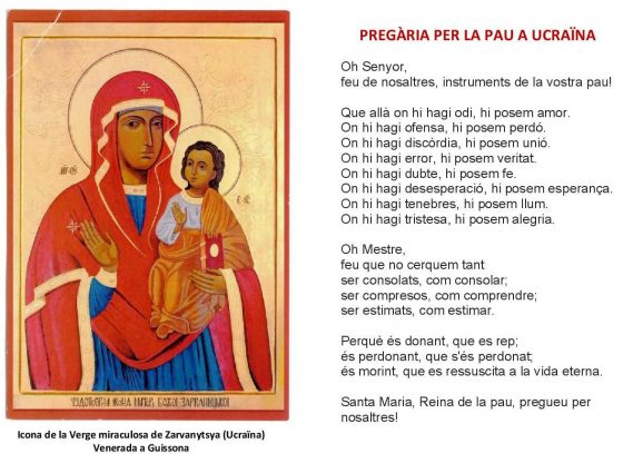 “Ara no tanco l’església”, explica Mn. Balagué, “contínuament hi entra gent a resar”. De fet, l’església ha estat sovintejada tothora des del moment de la invasió russa, com a recer de pau i pregària. La icona de la Mare de Déu de Zarbanitsa, especialment venerada pels cristians grecocatòlics, acompanya totes celebracions, com la pregària de sant Francesc d’Assís “Oh Senyor, feu de nosaltres instruments de la vostra pau!”, en català i ucraïnès. Una de les celebracions destacades va ser la que va presidir l’arquebisbe Joan Enric Vives, el 26 de febrer, amb la comunitat grecocatòlica i ortodoxa de la ciutat de Guissona i altres pobles veïns.