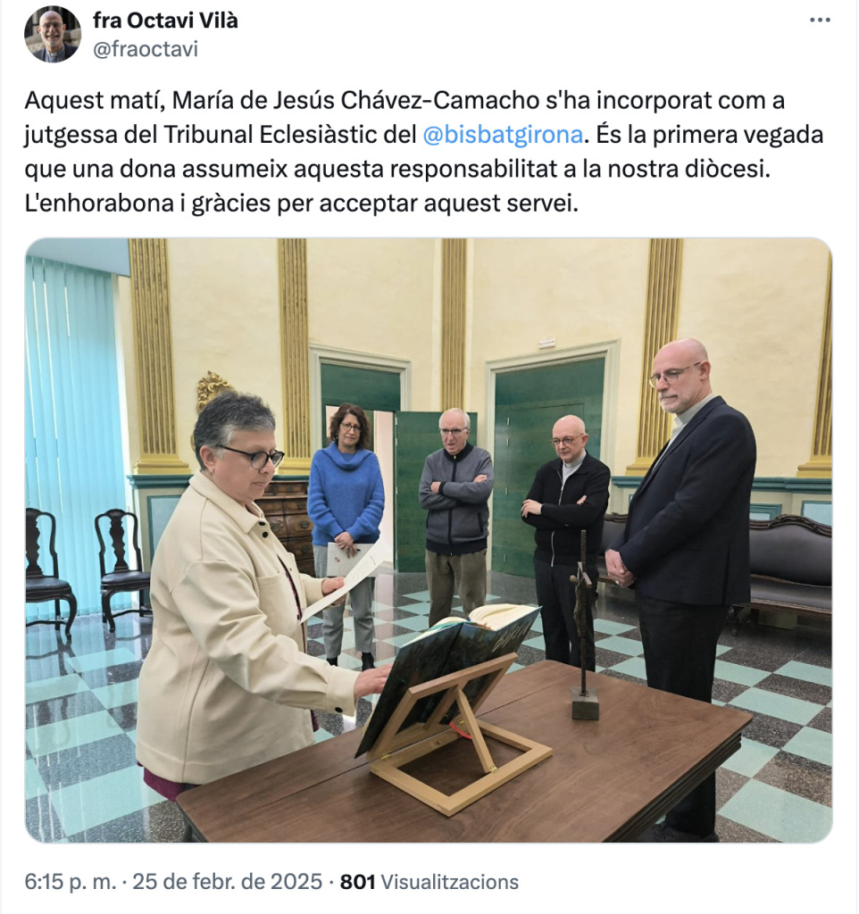 Des del 20 de febrer passat, el Tribunal Eclesiàstic del bisbat de Girona compta amb la seva primera jutgessa diocesana. Es tracta de María de Jesús Chávez-Camacho, que va ser nomenada per aquesta responsabilitat en un acte de jurament presidit pel bisbe de Girona, fra Octavi Vilà, i el vicari judicial, Mn. Rafel Felipe, i amb la presència de la cancellera, M. Teresa Cebrià, i el jutge diocesà Mn. Cosme Badia.