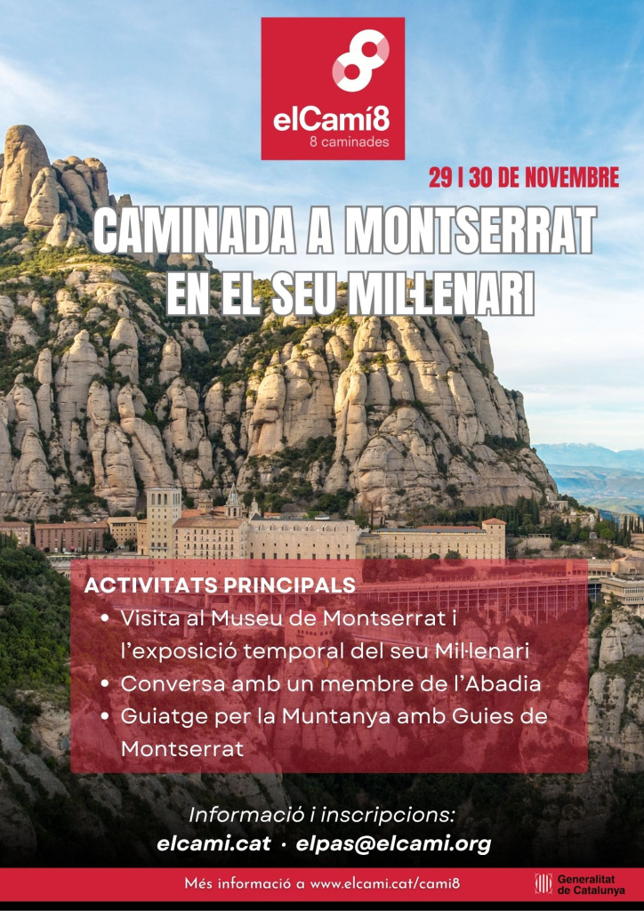 El cap de setmana del 29 i 30 de novembre, CAMÍ8 arribarà a Montserrat, on ha organitzat una caminada guiada especial amb motiu del mil·lenari del monestir. La ruta permetrà als visitants descobrir el patrimoni natural, cultural i espiritual de la muntanya santa.