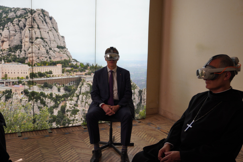 Salvador Illa i el Pare Manel Gasch i Hurios han estrenat l’experiència de realitat virtual de 360º amb imatges espectaculars de l’abadia de Montserrat.