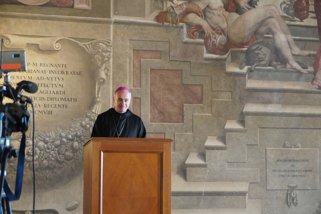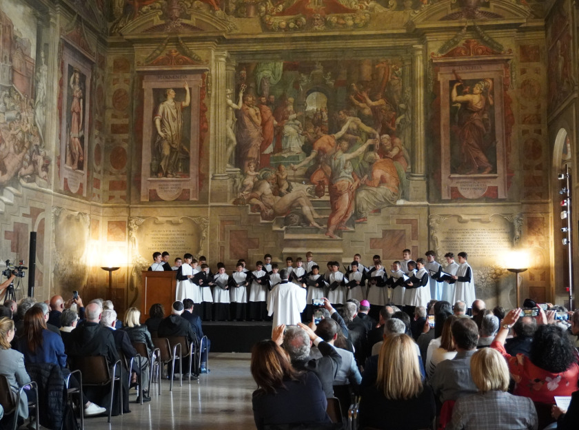 Per la seva part, l’abat de Montserrat, a més a més d’anunciar “l’honor i el privilegi de poder exposar a Roma”, cor del catolicisme, ha recordat com, per a la comunitat benedictina de Montserrat, “el lloc més proper i familiar, fora de Montserrat, és Roma”, un escenari en el qual trobem el Col·legi Benedictí de Sant Anselm, on gran part dels religiosos de l’abadia hi han anat a seguir estudis o a formar-se. Ha clos el seu discurs subratllant la importància de la pau, recordant que “en molts monestirs, trobem a l’entrada o en el lema, la paraula Pau, pax. Rebutjar la violència de tota mena és una exigència humana, monàstica i cristiana”. L’acte inaugural ha finalitzat amb el cant de la “Salve Regina” i del “Virolai”, interpretats per l’Escolania.