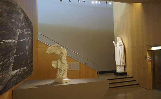 El projecte de reestructuració dels elements del vestívul ha consistit principalment en la col·locació d’uns models de guix de l’escultor Joan Rebull i una estructura de la Mare de Déu Assumpta, que han substituït una part de la imatge gràfica del vestíbul. Com ha exposat el mateix P. Laplana, “els models de guix exposats a l’entrada del museu permeten una visió propera i impactant, i un diàleg visual amb els relleus definitius de la façana vistos al lluny“. D’altra banda, la Mare de Déu Assumpta, feta pel mateix autor, dona la benvinguda al visitant situada al capdavall de les escales d’accés.