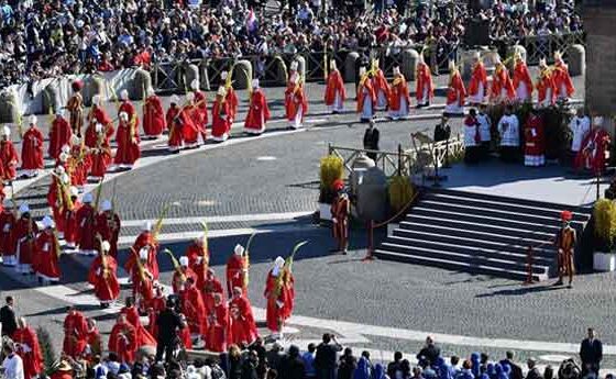 Abans d’aquests moments del migdia, el Papa ha presidit primer la benedicció dels Rams i després l’Eucaristia a la mateixa Plaça de Sant Pere del Vaticà. En l’homilia, Francesc ha assegurat que, “per seguir fidelment Jesús, hem de demanar la gràcia de fer-ho no pas de paraula, sinó amb els fets, i de portar la nostra creu amb paciència, sense rebutjar-la i portant-la cada dia mentre mirem el Senyor“. Davant de milers de persones, el Sant Pare també ha recordat que “aquesta celebració té com un doble gust, dolç i amarg, perquè és alegre i dolorosa en celebrar-se l’entrada del Senyor a Jerusalem, aclamat pels seus deixebles com a rei, ahora que es proclama solemnement el relat de l’Evangeli sobre la seva passió”. En un altre moment, el pontífex ha destacat que, des de fa 32 anys, la jornada té una dimensió joiosa enriquida amb la festa dels joves, amb la Jornada Mundial de la Joventut en l’àmbit diocesà. A partir del relat evangèlic segons Sant Mateu proclamat abans de la processó, el Sant Pare ha dit que es posa l’accent en l’entusiasme dels deixebles, que acompanyen el Mestre amb aclamacions festives. Igualment ha afegit que “aquest Jesús, que justament segons les Escriptures entra d’aquesta manera a la Ciutat Santa, no és un il·lús que sembra falses il·lusions, un profeta new age, un venedor de fum, sinó tot el contrari: un Messies ben definit, amb la fesomia concreta del servent de Déu i de l’home que va a la passió, perquè és el gran Pacient del dolor humà”. El Papa ha recordat que, el diumenge de Rams, els cristians celebren la festa d’un Rei mentre pensen en el sofriment que haurà de patir en aquesta Setmana Santa. Francesc ha fet una crida a pensar “en les calúmnies, els ultratges, els enganys, les traïcions, l’abandonament, el judici injust, els cops, els assots, la corona d’espines i, en definitiva, en el Via Crucis fins a la crucifixió”. En aquesta línia, ha comentat que Jesús “no va prometre mai honors i triomfs, motiu pel qual sempre va avisar als seus amics que el camí era aquest i que la victòria final passaria a través de la passió i de la creu”. Finalment, el pontífex ha assegurat que Crist “és present en molts dels nostres germans i germanes que avui pateixen com ell a causa d’un treball esclau, pels drames familiars, per les malalties, a causa de la guerra i el terrorisme i per culpa dels interessos que mouen les armes”.