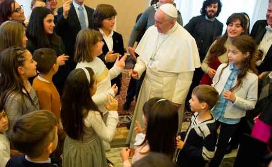Francesc ha fet seu el lema que l’Acció Catòlica té per a aquest any, «envoltats d’alegria», que en italià juga amb el doble sentit de la paraula “circ” per dir “circondati”, que vol dir precisament “envoltats”. El Sant Pare ha destacat que l’alegria es multiplica compartint-la i testimoniant-la en totes les nostres relacions: en família, a l’escola, a la parròquia i a tot arreu. En aquesta línia, i després de recordar l’anunci de l’àngel dient als pastors que no tinguin por, Francesc ha animat els nois i noies a “portar aquesta alegria en especial als avis, anunciat l’amor i la tendresa de Jesús”. Ha comentat que “aquesta alegria contagiosa es comparteix amb tothom, però de manera especial amb els avis, i aquesta és la missió”. També ha proposat als nois i noies que “demanin als més grans de la família moltes coses i els escoltin, perquè la seva experiència a la vida serà un gran do que ajudarà en el camí”.