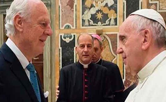 El bisbe de Roma ha mostrat la seva confiança que les comunitats i les persones que actuen al servei de les víctimes d’aquesta crisi rebin l’ajuda divina a través de la nova santa Teresa de Calcuta, model de caritat i misericòrdia. En aquesta audiència amb cooperants catòlics del Pròxim Orient, ha participat també l’enviat especial del secretari general de les Nacions Unides per a Síria, Staffan de Mistura, que ha destacat la importància de les últimes crides a la pau fetes pel Sant Pare. Ha recordat que, “a l’est d’Alep, 99 nens han mort i 203 han quedat ferits, i dos hospitals han estat colpejats”. A més, ha revelat que “s’han quedat 30 metges per a 375.000 persones”. Així es referia l’enviat especial del secretari general de l’ONU a la interpel·lació feta dimecres pel Papa a la consciència dels responsables dels bombardejos. Staffan Mistura ha recordat que Síria està avui plena d’armes i que, en realitat, no hi ha una solució militar, sinó només política, com ha recordat el Sant Pare.