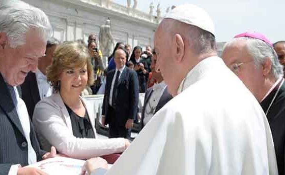 Francesc, en companyia del cardenal Lluís Martínez Sistach, l’arquebisbe de Tarragona, Jaume Pujol, i del bisbe de Terrassa, Josep Àngel Sàiz, s’ha apropat a la zona on es trobava el grup de catalans, que han pelegrinat aquesta setmana a Roma. A més d’Antoni Comas, també era present Jaume Vernet, president del Grup Avant de Terrassa, convocant del Concurs Bíblic de Catalunya. La trobada amb el Papa ha tingut lloc en el marc de l’exposició a Roma sobre els 30 anys del Concurs Bíblic. Durant els tres dies d’exposició, hi ha hagut també conferències pronunciades pel bisbe de Terrassa, Josep Àngel Sàiz, sobre la Pedagogia del Concurs Bíblic, de Pere Joan Sureda, sobre els màrtirs de la Federació de Joves Cristians, i de l’arquebisbe de Tarragona, Jaume Pujol, sobre les Arrels Cristianes de Catalunya.