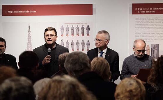 L’exposició repassa la gestació del projecte apartir del 1860 gràcies al mecenes Manuel Girona, el començament de les obresel 1887 i la finalització el 1913. Els visitants hi descobriran que la façananeogòtica, projecte del mateix Girona amb aportacions de l’arquitecte JoanMartorell, s’inspira en un disseny gòtic del 1408 obra d’un arquitecte del nordde França. Com diu el mateix títol, però, l’atenció se centra en AgapitVallmitjana (1832 – 1905), encarregat d’esculpir la majoria d’imatges de santsde la façana, especialment el Crist del mainell i tot els apòstols que l’envolten.L’escultor va aconseguir dotar les seves figures de la dolçor pròpia del gòticdel segle XV, sense renunciar als avenços tècnics del segle XIX. Ell i el seugermà Venanci van inaugurar l’escultura modernista a Catalunya, que després vanseguir noms tan notables com ara Josep Llimona.