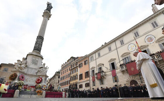 Seguint la tradició, el Papa també va anar a la plaça d’Espanya de Roma per a l’homenatge davant del monument a la Immaculada Concepció. Francesc va resar davant del monument i va deixar un ram de flors als peus de la columna.