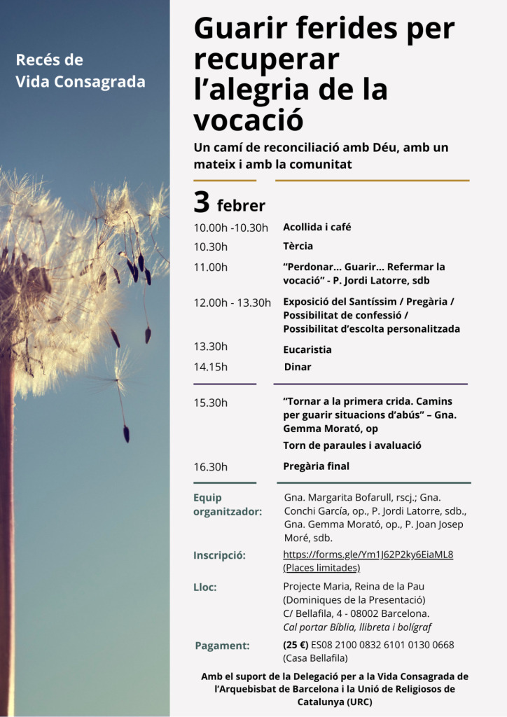 La primera activitat és un recés de vida consagrada amb el títol Guarir ferides per recuperar l’alegria de la vocació. Serà el 3 de febrer al Projecte Maria, Reina de la Pau, de les Dominiques de la Presentació, al carrer Bellafila, 4, de Barcelona.