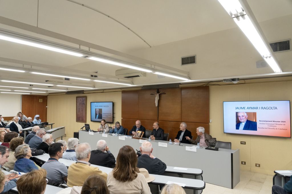 “Agraeixo de tot cor aquest reconeixement i el dedico al jesuïta el Dr. Josep M. Coll i Alemany (1934-2017), que em va introduir en el personalisme”, ha expressat Jaume Aymar, dijous 16 al vespre, en recollir en una sala Sant Jordi del Seminari Conciliar de Barcelona plena el Reconeixement Emmanuel Mounier. El Dr. Aymar (Barcelona, 1957) ha agraït especialment l’assistència de les germanes del P. Coll a l’acte.