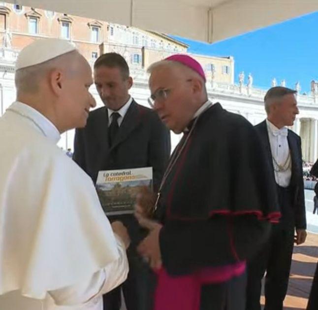 En el moment de la salutació, com ha explicat Planellas, ha parlat al Pontífex de l’Església de Tarragona i dels inicis del cristianisme a la península Ibèrica, i li ha recordat que la ciutat té el títol de “primada” per aquest motiu històric. En aquest context, li ha fet lliurament de dos llibres: un sobre els inicis del cristianisme a la península Ibèrica i un altre sobre la catedral primada.