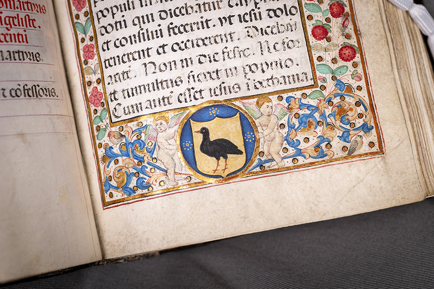 El volum va ser encarregat a principis del segle XVI per la poderosa família Gralla, originària de Lleida i emparentada per casament amb el llinatge Desplà. La propietat de la família queda palesa en l’escut d’armes familiar (una gralla negra sobre fons d’or i atzur), emmarcat per dos àngels, present en el llibre.