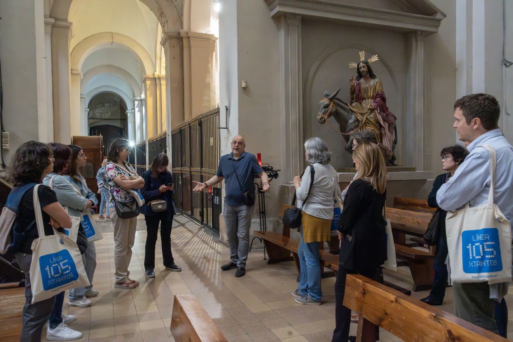 La segona parada ha estat a la parròquia de Sant Agustí, al Raval, un barri marcat per la diversitat cultural i les necessitats socials. Allí el grup s’ha trobat amb Santiago Pérez, membre del consell parroquial i de la Pontifícia i Reial Confraria del Gran Poder i Esperança Macarena, establerta canònicament en aquesta parròquia. Pérez ha explicat que el temple està viu i actiu gràcies als grups llatinoamericans, filipins i d’altres orígens que s’hi reuneixen cada setmana per viure la fe i també per cercar-hi suport.