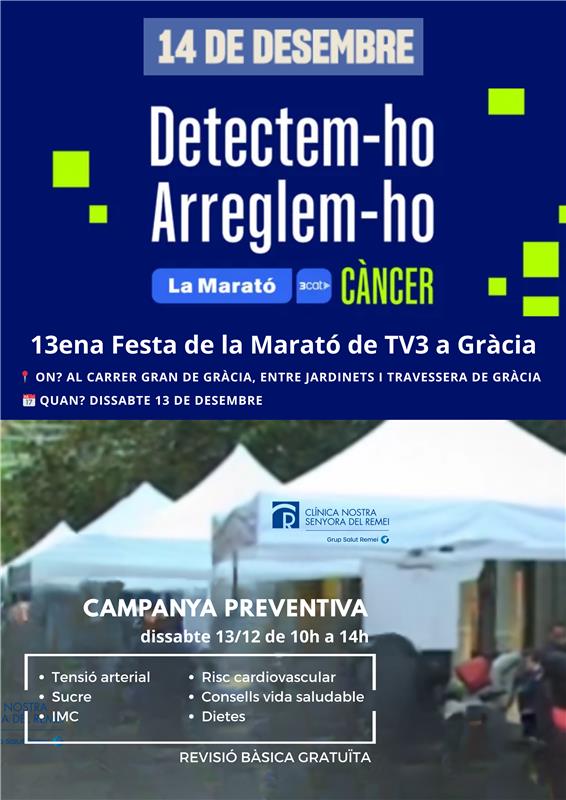 La Clínica Nostra Senyora del Remei se suma als actes que el barri de Gràcia organitza amb motiu de la Marató de TV3, el dissabte 13 de desembre, dedicada a la divulgació i l’impuls de la recerca en càncer, una malaltia que continua sent una de les principals causes de mort a Catalunya i arreu del món.
