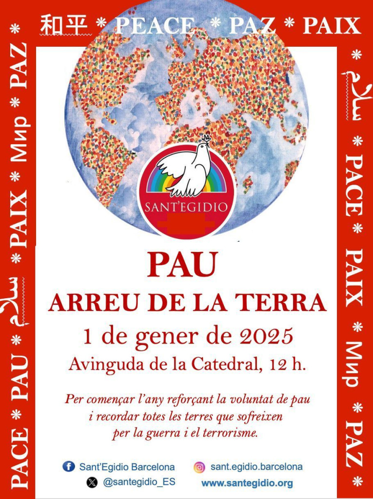 L’1 de gener l’Església celebra la Jornada Mundial de la Pau. Amb aquesta avinentesa, la Comunitat de Sant’Egidio organitza iniciatives a tots els continents per sostenir el missatge del papa Francesc a favor de la pau. La convocatòria a Barcelona serà a l’avinguda de la Catedral a les dotze del migdia l’1 de gener.