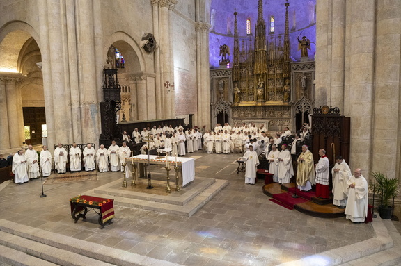 Un cop presentades les ofrenes, la celebració ha donat pas a la litúrgia eucarística, durant la qual l’arquebisbe Joan ha beneït els olis dels malalts i s’ha pregat pels preveres difunts en el darrer any: el P. Francesc Xammar i Mn. Alfons Vilà. Després de la comunió, ha tingut lloc la benedicció dels olis dels catecúmens i la consagració del crisma, que s’utilitzarà per a la unció en els sagraments del baptisme, la confirmació, l’ordenació de preveres i bisbes i també per a la dedicació de temples.
