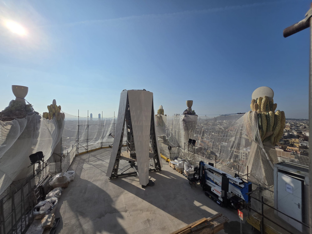 Durant la roda de premsa, els fotògrafs i els equips de televisió han tingut l’oportunitat de pujar a les cobertes situades a 54 metres per veure de prop algunes peces que formaran part de la creu de la torre.