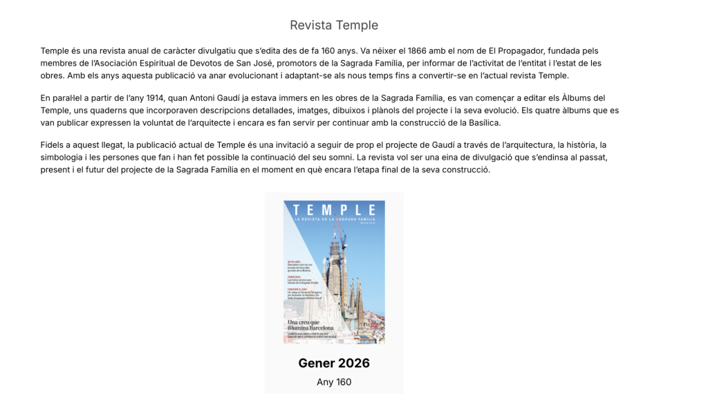 “La revista Temple té els seus orígens en El Propagador, una publicació que els membres de l’Associació Espiritual dels Devots de Sant Josep, promotors de la Sagrada Família, van fundar el 1866 per informar de l’activitat de l’associació i de l’estat de les obres. Amb el temps, va evolucionar fins a convertir-se en l’actual Temple.”