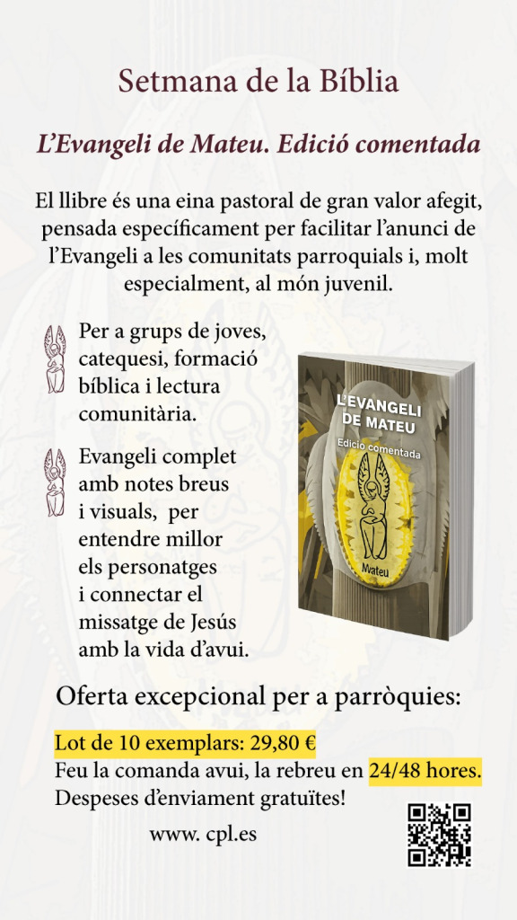 Amb motiu de la X Setmana de la Bíblia, que ha començat aquest 25 de gener, Diumenge de la Paraula, el Centre de Pastoral Litúrgica (CPL) ha publicat una edició comentada especial de l’Evangeli de Mateu, el primer dels llibres que formen el Nou Testament. Aquesta edició, impulsada per les entitats promotores de la Setmana de la Bíblia (Abadia de Montserrat, Associació Bíblica de Catalunya, Centre de Pastoral Litúrgica, Editorial Claret, Fundació Escola Cristiana de Catalunya, Ràdio Estel – Catalunya Cristiana i Fundació Joan Maragall), vol apropar el text evangèlic a les noves generacions i facilitar-ne la comprensió en contextos de catequesi, formació i lectura comunitària.