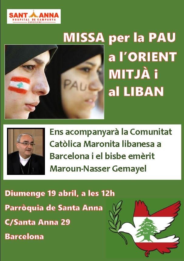 Aquest diumenge 19 d’abril, la parròquia de Santa Anna de Barcelona acollirà una missa per la pau a l’Orient Mitjà i, especialment, al Líban. La celebració, prevista a les 12 h, comptarà amb la participació de la comunitat catòlica maronita libanesa resident a la ciutat i amb la presència del bisbe emèrit Maroun-Nasser Gemayel.