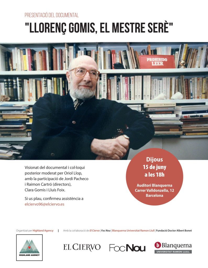 El pròxim dijous 15 de juny a les 18.00 h tindrà lloc a l’Auditori de la Facultat de Comunicació i Relacions Internacionals Blanquerna la presentació del documental Llorenç Gomis, el mestre serè, un treball impulsat per Highland Agency i dirigit per Jordi Pacheco i Raimon Cartró.