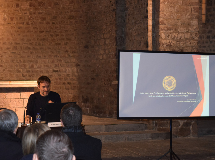 El Dr. Joan Duran-Porta, professor de la Universitat Autònoma de Barcelona i especialista en orfebreria medieval, ha aprofundit en les peces d’orfebreria romànica de la catedral Santa Maria d’Urgell conservades al Museu-Catedral, tot situant-les en el context de l’orfebreria romànica a Catalunya, en una conferència organitzada pel mateix Museu-Catedral de la Seu d’Urgell. A l’acte hi han assistit Mons. Josep-Lluís Serrano; el delegat de Patrimoni i vicari general, Mn. Josep M. Mauri; el rector de la parròquia de Sant Ot, Mn. Ignasi Navarri, i diversos canonges de la catedral. La intervenció del Dr. Duran, autor d’una tesi doctoral en orfebreria medieval, s’integra en el procés d’elaboració del nou catàleg del Museu-Catedral de la Seu d’Urgell, previst per a l’any vinent. L’especialista és l’encarregat de l’estudi del conjunt d’orfebreria que formarà part del nou catàleg procedent del fons del museu diocesà.