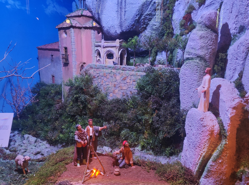 Per una banda, hi ha la Santa Cova, on va ser trobada la Mare de Déu de Montserrat. La llegenda diu que d’allà no es volia moure i li erigiren un santuari. En aquest diorama es representa l’anunciació als pastors, ja que van ser pastors els qui van trobar la imatge.
