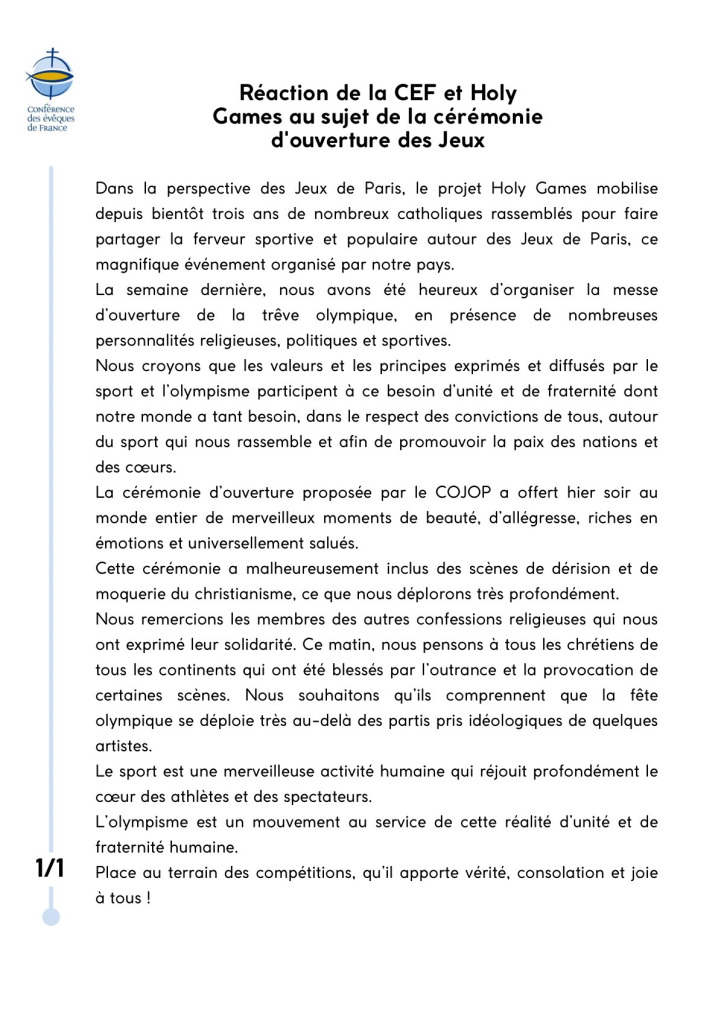 L’endemà mateix de la cerimònia d’obertura dels Jocs de París, la Conferència Episcopal Francesa ha emès un comunicat en què deplora profundament “la burla i l’escarni” envers el cristianisme viscuda en una paròdia de l’Últim Sopar.