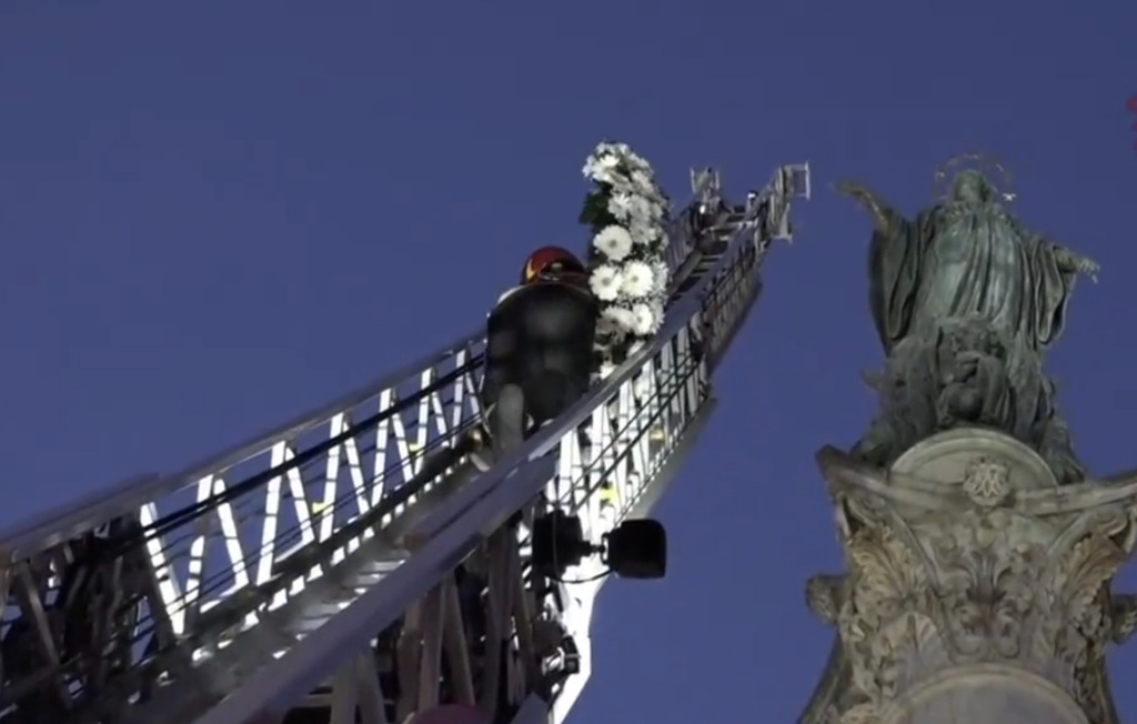 Poques hores abans de l’arribada del Pontífex a la Piazza di Spagna, els Bombers de Roma han col·locat la tradicional corona de flors al capdamunt de l’estàtua. Aquest emotiu tribut a la Immaculada Concepció, que es remunta a 1923, deixa cada any una imatge espectacular: un bomber que puja fins a l’estàtua, col·loca les flors, realitza la salutació militar i fa sonar les sirenes.