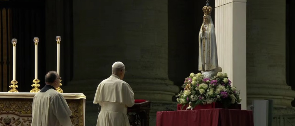 El Papa prega als peus de la imatge original de la Mare de Déu de Fàtima / Captura de Youtube.