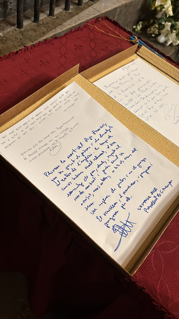 “Plorem la mort del papa Francesc, que ha posat els pobres i els desvalguts al centre de l’Església”, ha escrit Salvador Illa en el llibre de condolences.