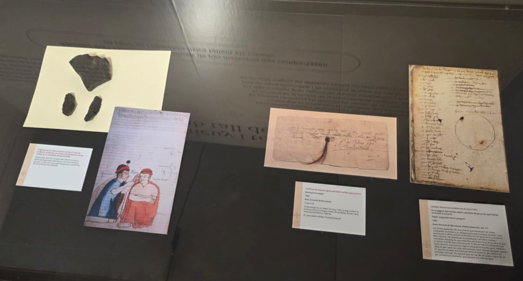 En una de les vitrines es pot contemplar un curiós manuscrit de l’any 1543, que es conserva a l’Arxiu Diocesà de Barcelona, on el bisbe auxiliar Joan Jubinus escriu que li ha conferit la tonsura a Mateu Torell. El certificat… va acompanyat d’un floc de cabells de l’ordenant! També hi ha un paper, enquadernat en pergamí, del 1303, amb una llista de persones que havien sol·licitat la tonsura. S’hi adjunta un dibuix que indica la dimensió exacta que havia de tenir una tonsura.