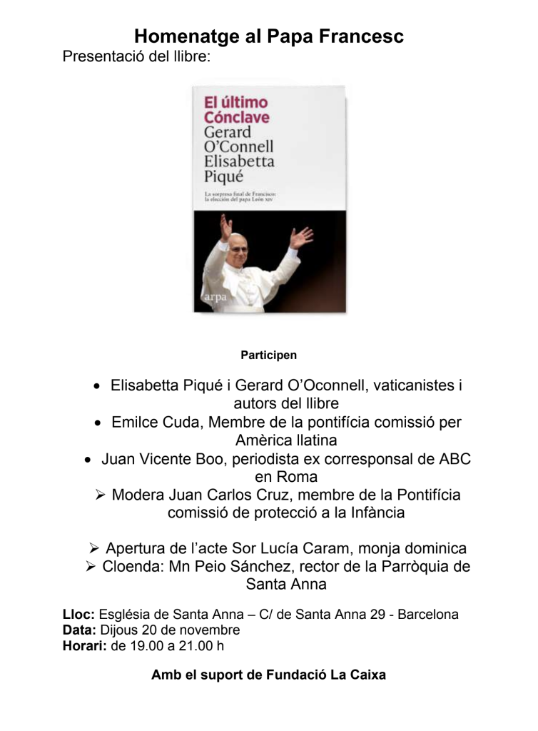 Barcelona i Manresa acolliran aquest mes de novembre un homenatge al papa Francesc amb la presentació del llibre “Cónclave: del papa Francesc al papa Lleó XIV”. Els actes, organitzats per Sor Lucía Caram, tindran lloc el dijous 20 de novembre a les 19.00 h a l’Església de Santa Anna de Barcelona i el divendres 21 de novembre a les 19.00 h al Convent de Santa Clara de Manresa.