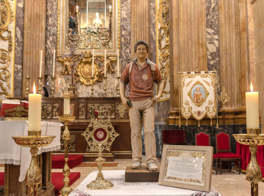 Una talla de fusta menuda mostra un Carlo Acutis abillat amb la seva indumentària característica: texans, polo de color granatós, vambes, motxilla i mòbil a…