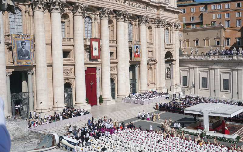 Ala façana de la basílica de Sant Pere del Vaticà onejaven els estendards dels sants Carlo Acutis (1991 2006) i Pier Giorgio Frassati (1901-1925). Dos…